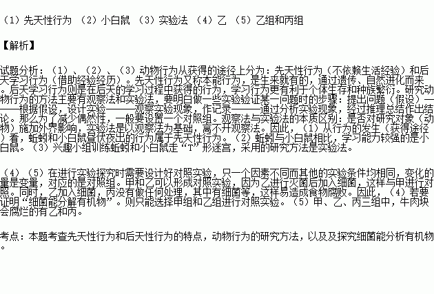 (3)兴趣小组训练蚯蚓和小白鼠走“T”形迷宫,采用的研究方法是 。