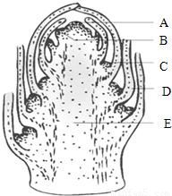 由图可知:A是生长点有很强的分生能力,属于分生组织,可以使芽轴不断伸长;B叶原基将来发育成幼叶;C芽原基将来发育成侧芽.D幼叶将来发育成叶;E芽轴将来发育成茎.因此植物的枝条的生长主要是由于芽的生长点不断分裂形成的;掐去一根枝条的顶尖,就掐去了生长点.故这根枝条不能继续往上长.