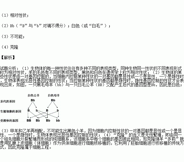 羊的白毛由显性基因B控制,黑毛由隐性基因b控制。下图为一只黑毛母羊与一只白毛公羊交配产生后代的遗传图。请根据图回答: