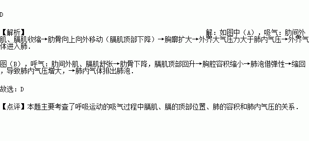 (2013•天桥区三模)当人体处于如图B所示状态时,呼吸肌的状态和气体经过的路线分别是( )