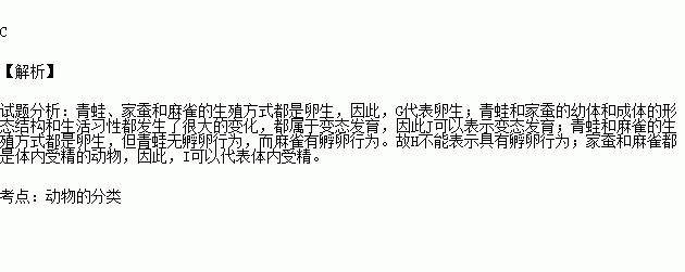 右图是对生殖与发育特点的比较,其中三个圆分别代表三种动物,各圆的重叠部分表示共同特点。图中字母所代表的特点,错误的是