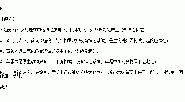 C.草履虫游向食物 D.学生听到铃声走进教室