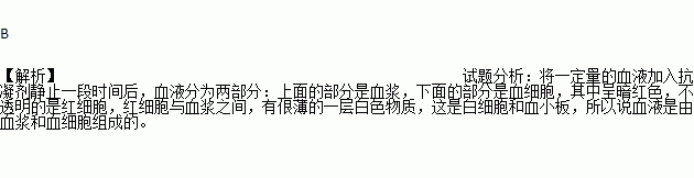 小刚同学在探究血液的成分时,将新鲜的鸡血分别放入A、B、C、D四个试管内,在A、D两试管内加入了抗凝剂, B、C不做任何处理,静置较长一段时间后,下列图示中正确的是( )