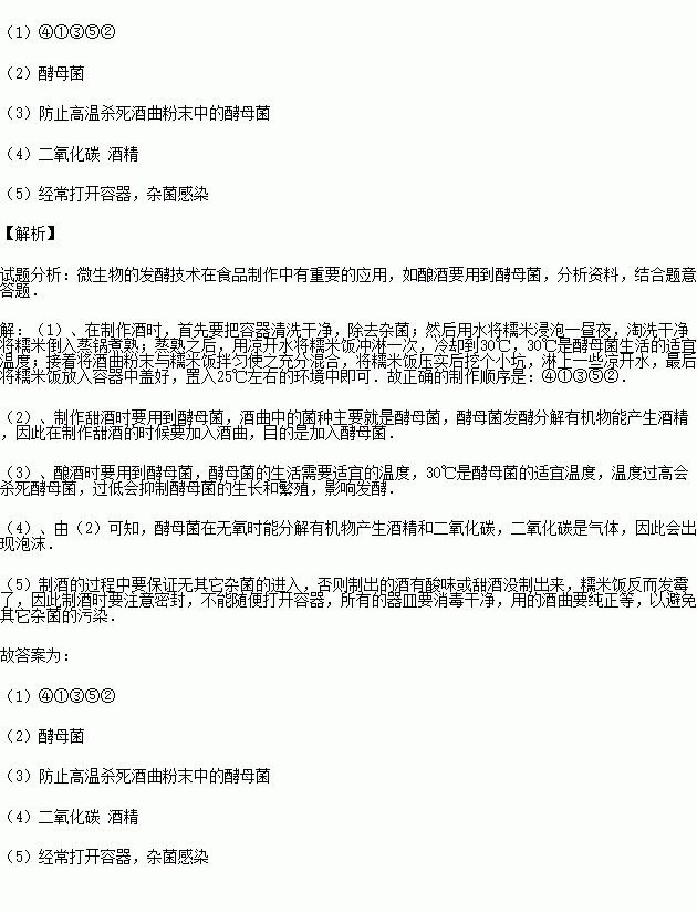 家庭制作甜酒有如下工序:①将糯米倒入蒸锅煮熟 ②将糯米饭放入容器中盖好,用毛巾包裹起来置入温暖的地方 ③用凉开水将糯米饭冲淋一次,冷却到30℃④将糯米用水淘洗干净后浸泡一昼夜 ⑤将酒曲粉末与糯米饭拌匀(以下容器、毛巾等均要求消毒).请对照制作工序,回答下列问题:
