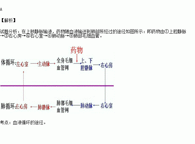 某人因肺炎需要往上肢的静脉中输液,药物随血液送到肺部时,所经过的途径是[来源om①上腔静脉 ②下腔静脉 ③右心房 ④右心室 ⑤体毛细血管