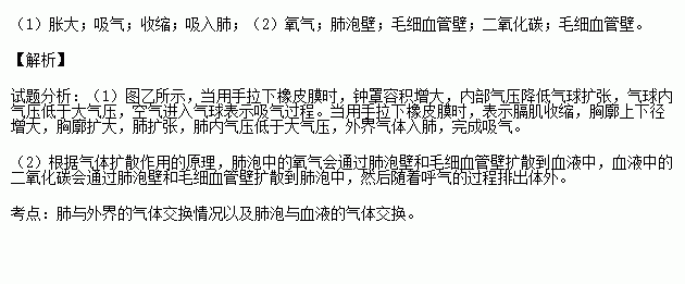 £¨1£©ÈçͼÒÒËùʾ£¬ÓÃÊÖÏÂÀÏðÆ¤Ä¤Ê±ÆøÇò»á £¬±íʾ ÆøµÄ¹ý³Ì¡£ÔÚÈËÌåÄÚ£¬´Ë¹ý³Ì½øÐÐʱ£¬ÏðƤĤ´ú±íµÄ½á¹¹»á £¨Ìî¡°ÊÕËõ¡±»ò¡°ÊæÕÅ¡±£©£¬