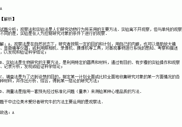 某同学自幼喜欢绘画,为画好牛的图案,有时站在自家牛棚里看牛的各种姿态,一站就是一两个钟头,这位美术爱好者研究牛的方法主要运用的是( )