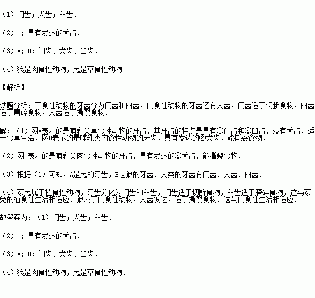 如图是兔和狼的牙齿分化示意图,据图回答: