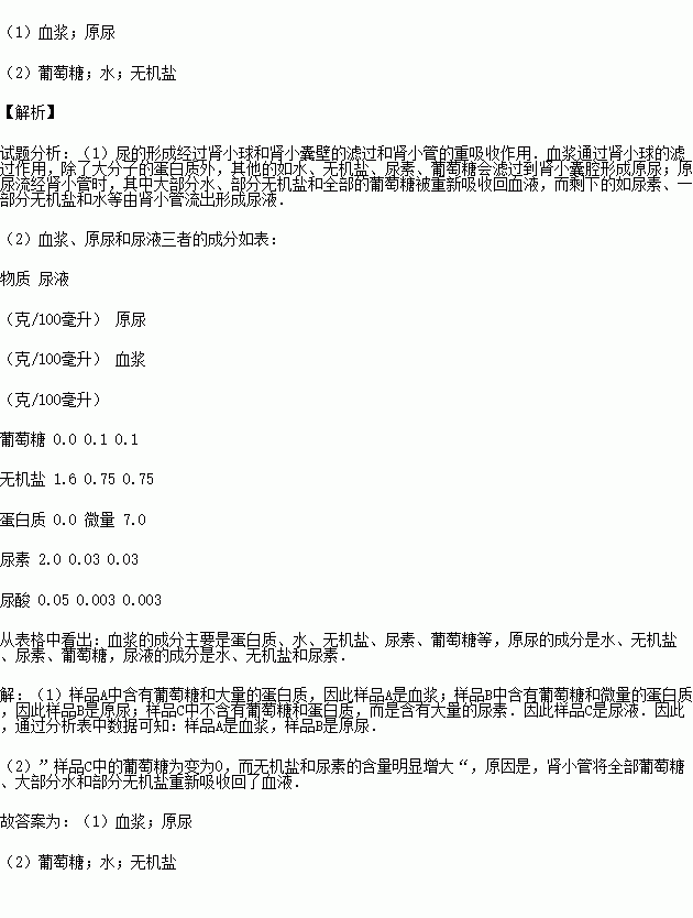 £¨2£©ÑùÆ·CÖÐµÄÆÏÌÑÌÇΪ±äΪ0£¬¶øÎÞ»úÑκÍÄòËØµÄº¬Á¿Ã÷ÏÔÔö´ó£¬ÔÒòÊÇ£¬ÉöС¹Ü½«È«²¿ ¡¢´ó²¿·Ö ºÍ²¿·Ö ÖØÐÂÎüÊÕ»ØÁËѪҺ£®