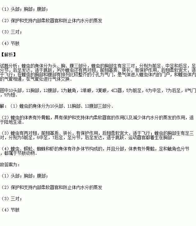 ﹙1﹚蝗虫的身体分为(10) 、(11) 、(12) 部.