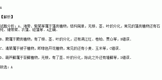 (2015秋•张掖校级期末)“海带炖排骨”和“紫菜蛋汤”是人们喜爱的佳肴,你知道海带和紫菜与下列哪种植物同属于一类吗?( )