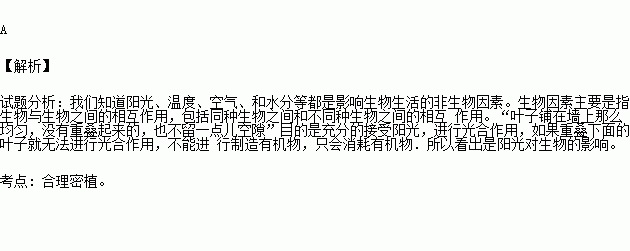 叶圣陶先生曾这样描述爬山虎:“哪些叶子铺在墙上那么均匀,没有重叠起来的,也不留一点儿空隙”(如图).从生物学角度分析,这种现象体现了哪一种非生物因素对生物的影响?( )