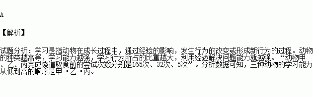 某生物学习小组利用甲、乙、丙三种动物探究动物的绕道取食行为。动物甲、乙、丙完成绕道取食前的尝试次数分别是 165 次、32 次、5 次。分析数据可知,这三种动物的学习能力从低到高的顺序是: