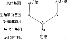 (3)用长穗水稻与短穗水稻杂交,其后代都是短穗,说明短穗是显性性状,长穗是隐形性状.如果控制水稻短穗与长穗的基因分别用A和a表示,那么亲代长穗水稻的基因组成是aa,亲代短穗水稻的基因组成是AA或Aa,短穗水稻与长穗水稻进行杂交,其基因分解图如下: