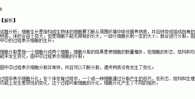 A.过程①表示细胞生长 B.过程③遗传物质发生了变化