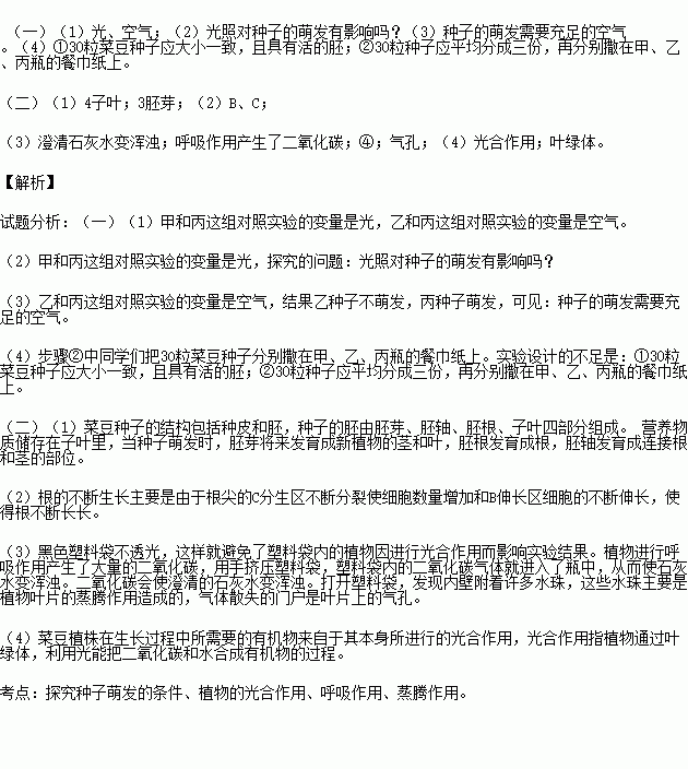 (一)①取三个无色的玻璃瓶,分别贴上甲、乙、丙的标签,瓶底各铺上两张餐巾纸并加入适量的水;