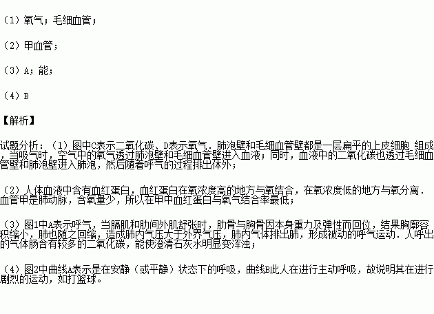 ͼ1Ϊijͬѧ·ÎÅÝÄÚÆøÌå½»»»Ê¾Òâͼ£¬A¡¢B´ú±íÉúÀí¹ý³Ì£¬C¡¢D´ú±í²»Í¬ÎïÖÊ£¬Çë»Ø´ð![]()