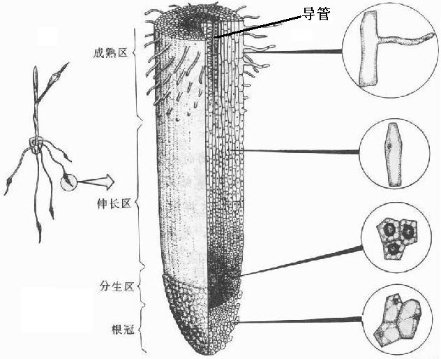 (3)吸收水分和无机盐;使根迅速伸长; 不断分裂出新细胞;保护分生区细胞