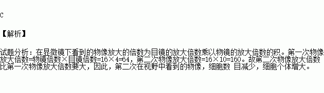 小明用显微镜观察洋葱表皮细胞时,第一次使用的目镜为16×,物镜为4X;第二次使用的目镜为16×,物镜为10×。小明第二次在视野中看到的物像与第一次相比( )