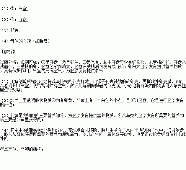 (2)培养皿里透明胶状物质②内有卵黄.卵黄上有一个白色的小点,是[ ] ,它是进行胚胎发育的部位.