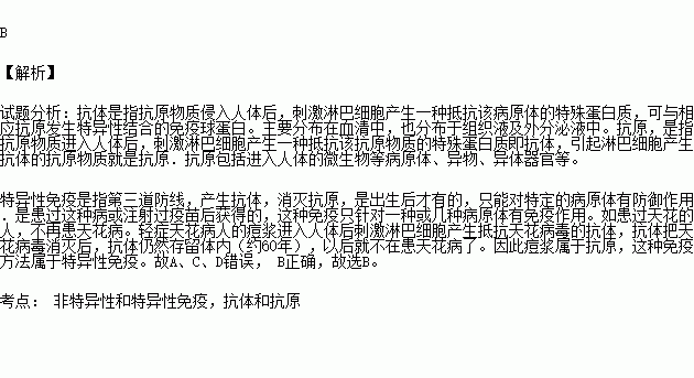 、早在10世纪我国就有人将轻症天花病人的痘浆接种到健康人身上,使人能预防天花病,那接种的痘浆和这种方法分别属于