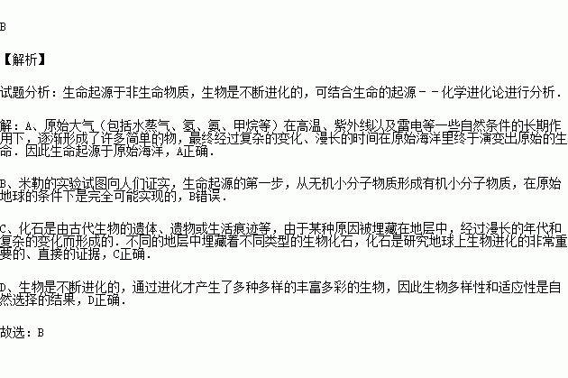 A.原始大气的成分中不含有氧气,原始生命诞生于原始海洋