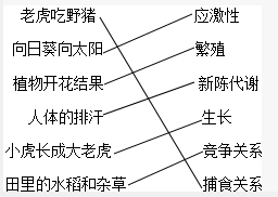 解答:解:老虎吃野猪属于捕食关系;向日葵向太阳属于应激性;植物开花结果属于繁殖现象;人体的排汗属于新陈代谢;小虎长成大老虎属于生长;田里的水稻和杂草属于竞争关系.