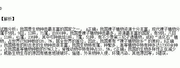 下列是对我国生物多样性的叙述,不正确的是( )
