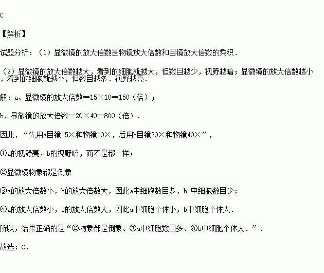 (2015秋•长沙校级期中)用显微镜观察洋葱鳞片表皮细胞装片的同一部位,先用a目镜15×和物镜10×,后用b目镜20×和物镜40×,结果正确的是( )