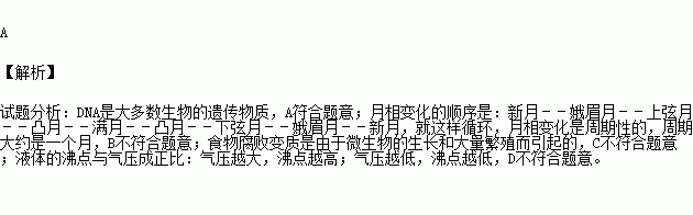 A.蛋白质是生物的遗传物质 B.月相呈现周期性变化
