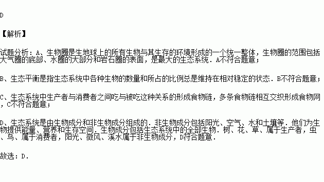 (2014秋•河南期末)“当你置身于一片树林中,你会看到高大的树木,不知名的花草,各种各样的小动物,枝叶间透过的阳光;你会听到微风吹过,树叶沙沙作响,不远处溪水淙淙、虫鸣鸟唱,此起彼伏…”文中描述的树、花、草、虫、鸟、阳光、微风、溪水等事物共同构成的统一整体叫( )
