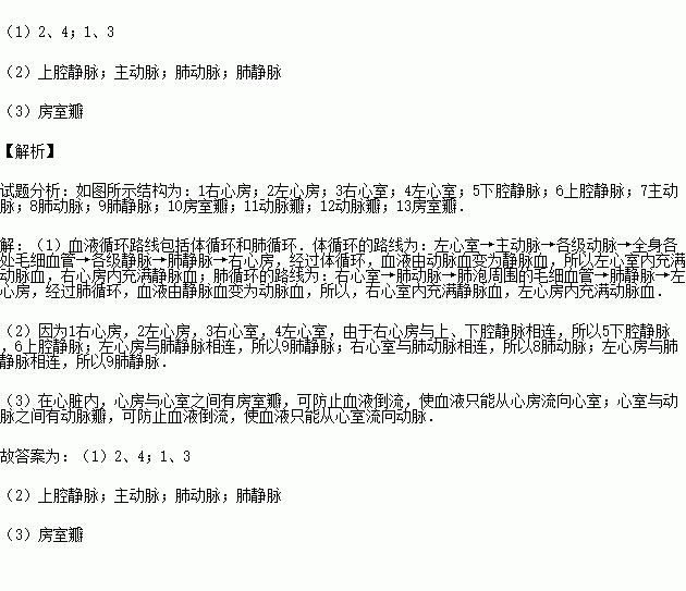 (1)在心脏的1、2、3、4四个腔中,充满动脉血的心腔有 ,充满静脉血的心腔有 .