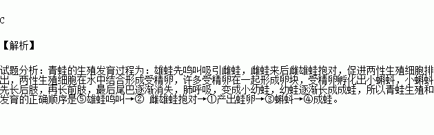 ①雌蛙产卵、 ②雌雄抱对、③蝌蚪、④成蛙、⑤雄蛙鸣叫。请排出正确的顺序( )