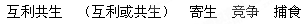 查看答案和解析>> 科目:初中生物 来源:2012-2013学年江苏宿迁青华中学七年级上学期期中考试生物试卷(带解析) 题型:综合题 在生态系统中,生物与生物之间存在着多种关系。请将下列表示生物之间关系的序号填在表中相应的空格内。