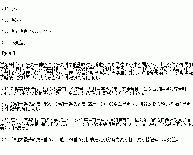 某中学“爱科学”实验小组的探究“馒头在口腔中的变化”时,进行了以下四种处理:其中第①种处理是模拟了口腔中的牙齿,舌,唾液的作用,第②③④种处理都是①的对照实验,利用你所学的知识,回答下列问题