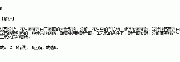 花生霉变、患流行性感冒、制作甜酒分别与下列哪种微生物作用有关( )