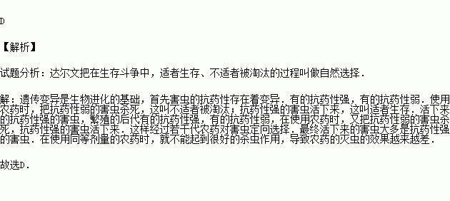 长期使用某种农药会导致灭虫的效果越来越差,这是因为某些害虫产生了抗药性,并且得以保存和繁殖.害虫产生抗药性的原因是( )