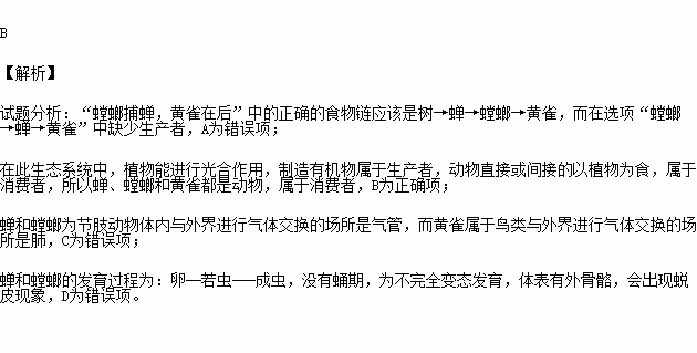 D.蝉、螳螂和黄雀体内与外界进行气体交换的场所是气管