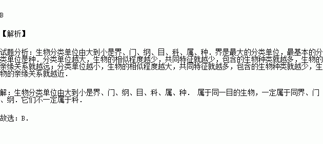 为了科学地将生物进行分类,生物学家把它们分成不同等级的分类单位,属于同一目的生物,它们不一定属于( )