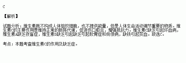 A.体内缺钙 B.体内缺铁 C.体内缺维生素C D.体内缺维生素D