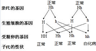 解答:解:白化病的致病基因是(h),则控制正常肤色的基因是H.文文却是白化病人,则其基因组成是hh,他的这对基因由父母双方各提供一个,即其父母除含有一个正常的基因H外,都含有一个致病基因h,即其父母的控制肤色的基因组成都是Hh,其遗传图解如图所示: