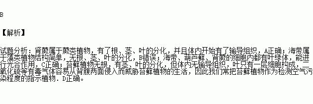 下列关于海带、葫芦藓、肾蕨的叙述不正确的是( )