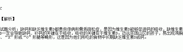 边远贫困山区的孩子,易出现“鸡胸”、“X”形或“O”形腿等畸形,这是因为他们吃的食物中长期缺乏( )