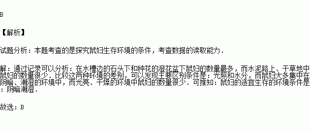 小明在校园里浇花时发现了几只鼠妇,如图所示.他和同学们对鼠妇的生活环境发生了兴趣,便一起去寻找探索,记录各处发现鼠妇的数据如下表:根据他们的记录,可知适宜鼠妇生存的环境条件是( )