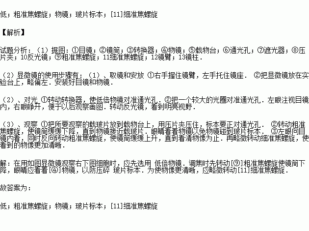 在用如图显微镜观察右下图细胞时,应先选用 (填“低”或“高”)倍物镜.调焦时先转动[9] 使镜筒下降,眼睛应看着[4] ,以防压碎 .为使物像更清晰,应略微转动[] .