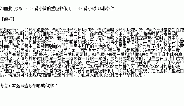 ⑵从表中液体C葡萄糖为0,试推测液体C可能是 。