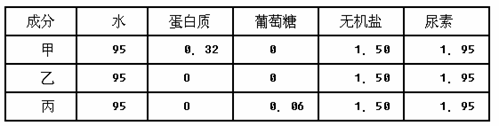 下表为某医院化验室对甲、乙、丙三人尿液成分分析的结果(单位:g/mL)。请根据表中的有关数据分析回答
