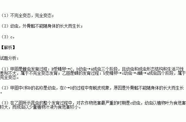 (3)如果乙图所示的昆虫是一种农业害虫,在整个发育过程中,对农作物危害最严重的时期是 (填图中的字母)。