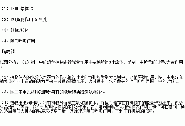 (1)图一中的绿色植物进行光合作用主要场所是[_________]_________(从图三中选填),是图一中所示的过程_________(选填“A”、“B”或“C”).