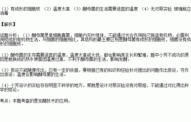 小芳学着妈妈做馒头:将适量酵母粉与面粉混匀后,加入适量清水糅和成面团,然后将面盒放入温水锅中。为了使面团发得更快,她将温水锅中的水换成了刚烧开的热水。一段时间后将面团取出做成馒头。结果,小芳蒸出的馒头不如妈妈做得松软多孔。请分析回答: